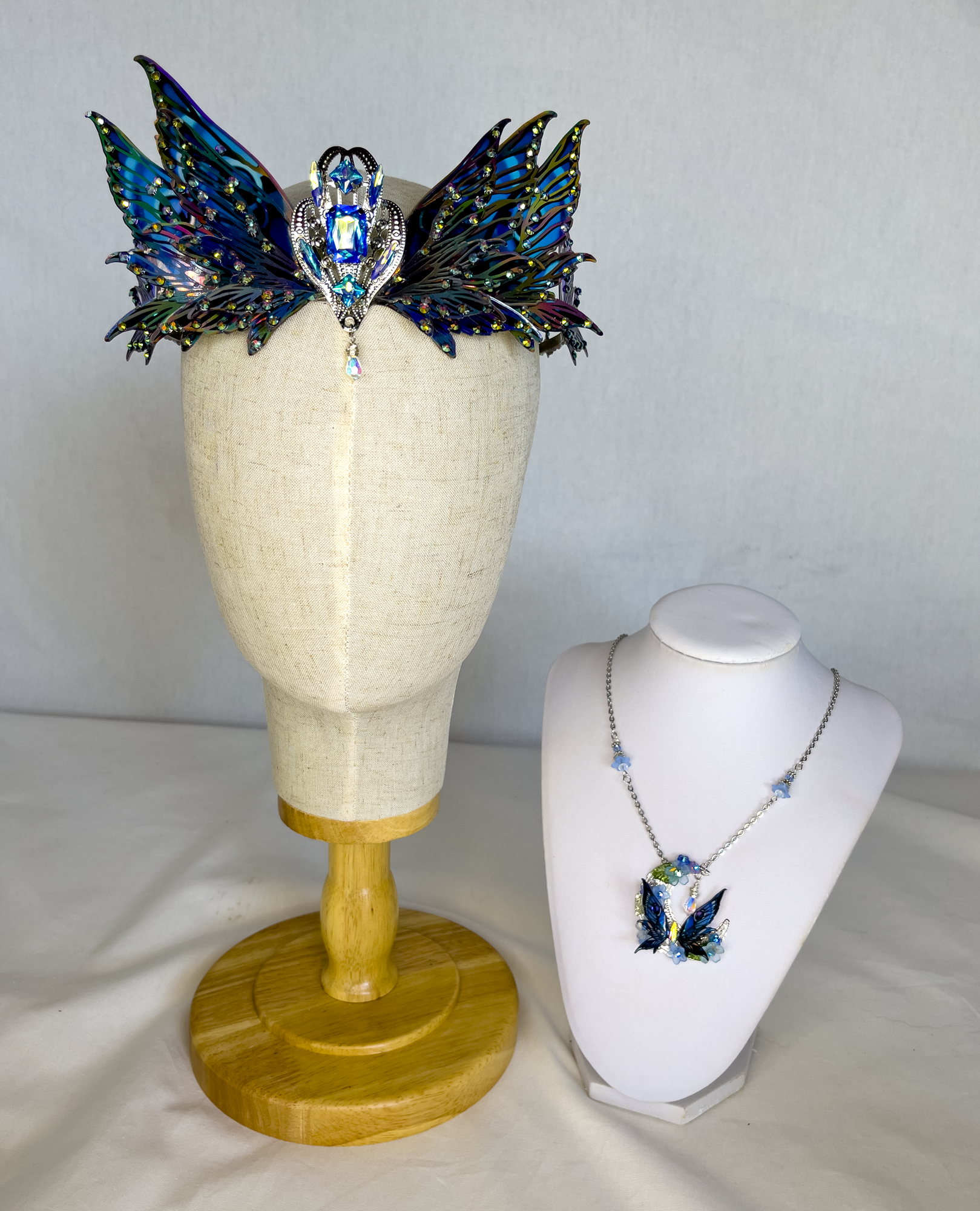 Saturated blues and shadowed iridescent hues shift subtly with light, echoing the structure of blue butterfly detailing within the original wing design. The central filigree focal is set with faceted stones in cool sapphire tones, anchoring the piece with quiet strength.